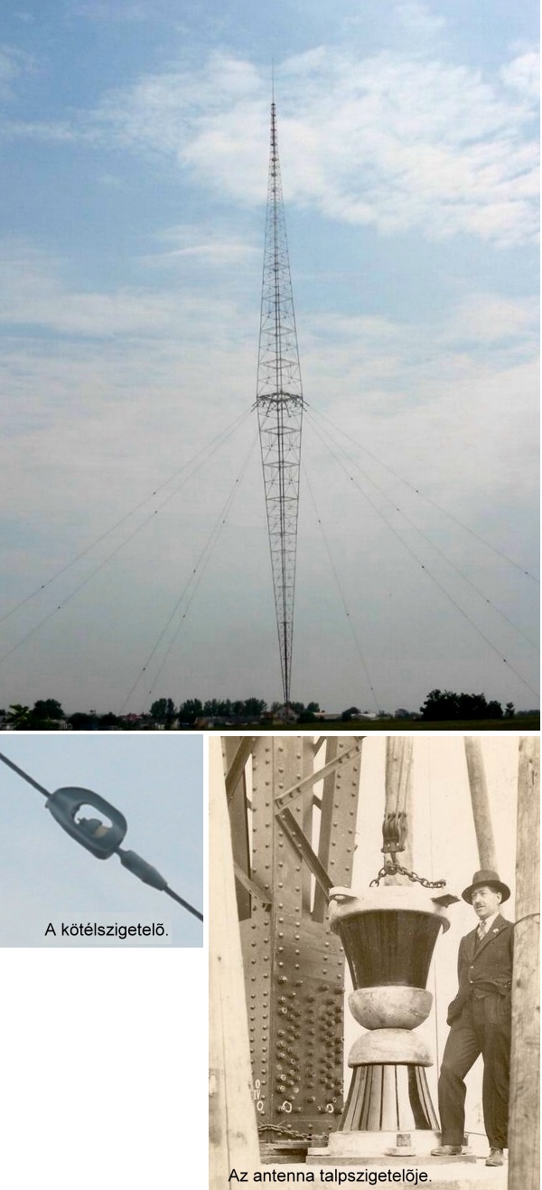 A torony akkori súlya 230 tonna, a talpszigetelőre nehezedő nyomás 480 tonna volt. Ez a nagy nyomás a tartókötelek feszítőereje következményeként alakult ki. A négyzet metszetű torony a középső 14,65 méter szélességű részen, 141 méter magasságban volt megfogva, nyolc kötéllel. A kötelekbe 5-5 darab szigetelőt építettek be, hogy ne zavarják a torony sugárzását. Két szigetelő közvetlen egymásután kapcsolva, a toronyra volt erősítve, három darab pedig aláosztotta a köteleket 60+60+30 méteres szakaszokra. A kötelek 88 tonnás betontömbökhöz lettek kihorgonyozva.